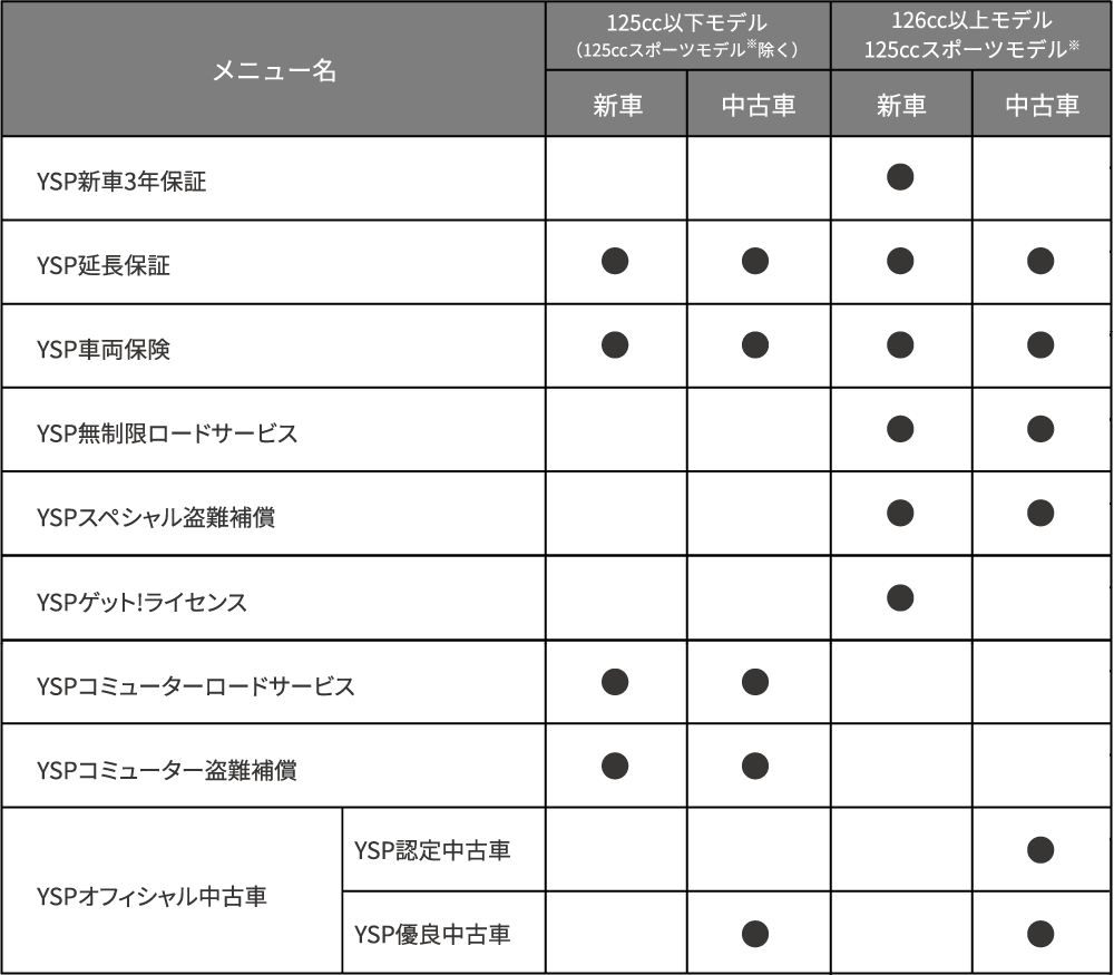 YSPではお客さまへ豊かなバイクライフをお届けするために、買う前も、買う時も、買った後も安心なサポートメニューを多数ご用意しています。